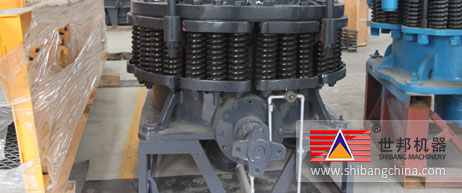 彈簧(huang)破(po)碎(sui)機(ji)工作時,電動機(ji)通過水平軸(zhou)(zhou)和一對(dui)傘齒(chi)輪(lun)帶動偏(pian)心軸(zhou)(zhou)套(tao)旋(xuan)轉(zhuan),破(po)碎(sui)圓錐軸(zhou)(zhou)心線(xian)在偏(pian)心軸(zhou)(zhou)套(tao)的迫動下做旋(xuan)擺運動,使(shi)得破(po)碎(sui)壁表面時而(er)靠(kao)近(jin)又時而(er)離開軋臼壁的表面,從而(er)使(shi)礦石在破(po)碎(sui)腔(qiang)內不斷地(di)受(shou)到擠壓和彎曲而(er)被破(po)碎(sui)。